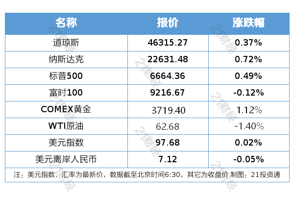 纽约股市三大股指9月19日上涨。截至9月19日收盘,道琼斯工业平均指数比前一交易日上涨172.85点,收于46315.27点,涨幅为0.37%;标准普尔500种股票指数上涨32.40点,收于6664.36点,涨幅为0.49%;纳斯达克综合指数上涨160.75点,收于22631.48点,涨幅为0.72%。